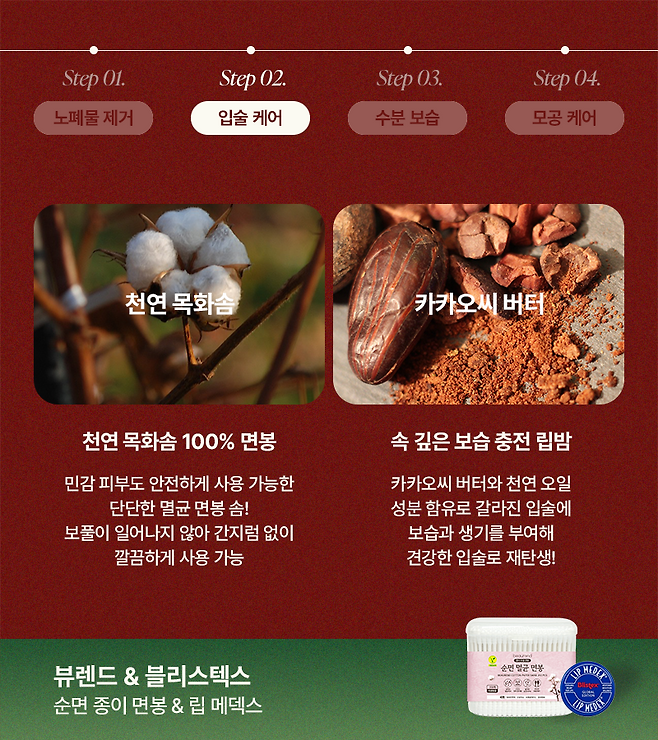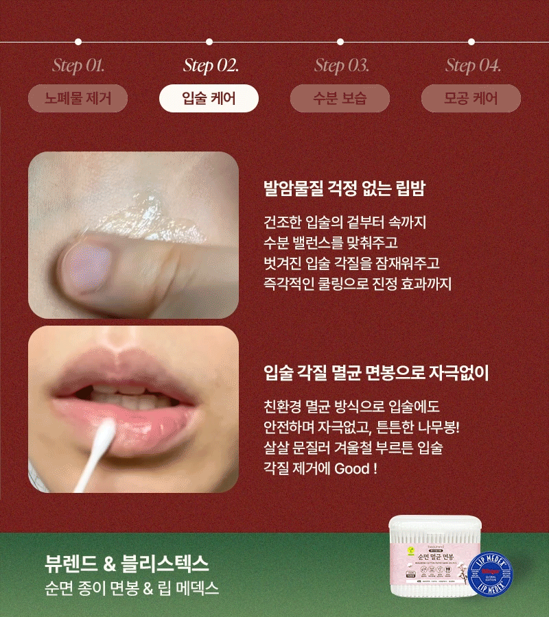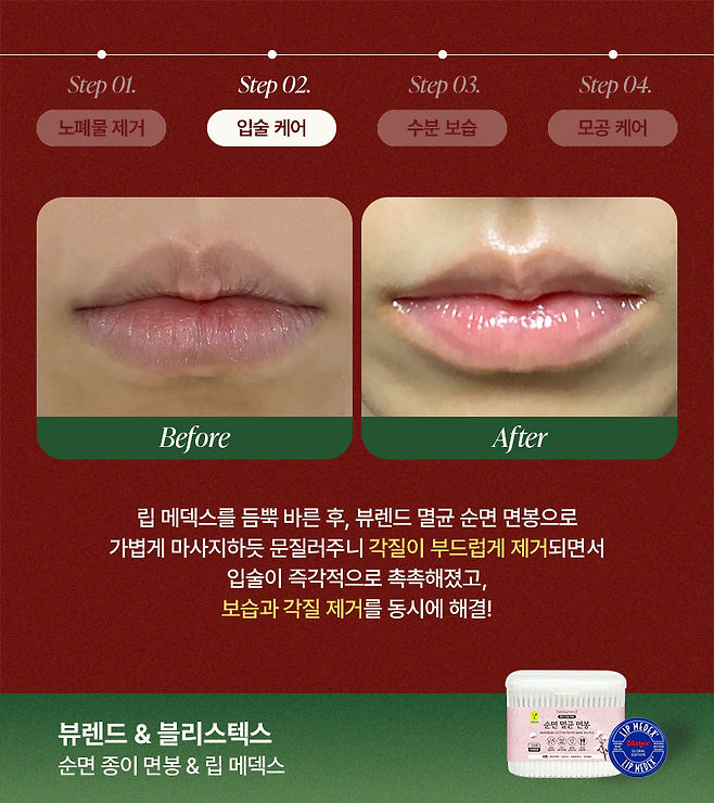 각질이 깔끔하게 제거되니 입술 표면이 매끄러워졌고 특히, 뷰렌드 면봉을 사용하니 자극 없이 효과적이었다.
