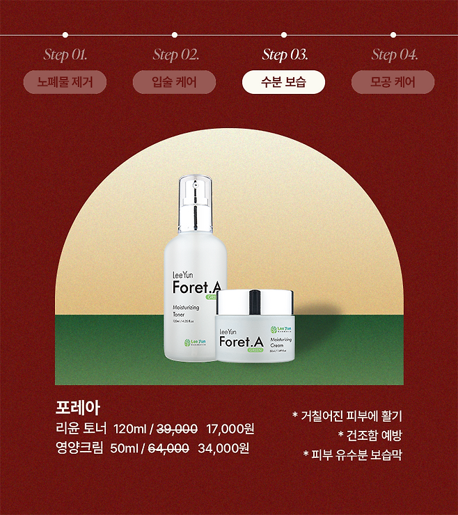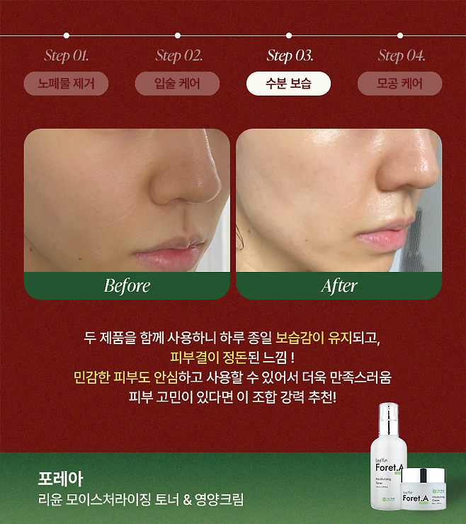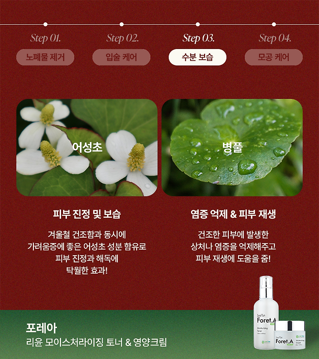 포레아의 리윤바이오 모이스처라이징 토너와 영양크림은 자연 유래 성분과 피부에 유익한 기능성 성분을 바탕으로 제작되었다고 한다.