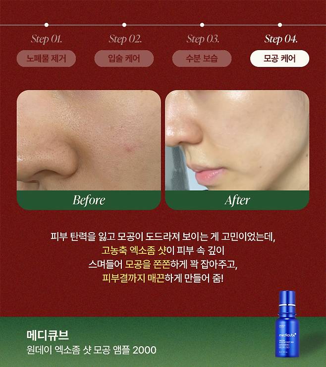 에디터는 메디큐브 원데이 엑소좀 샷 모공 앰플 2000을 사용하고 피부가 확연히 달라졌다. 앰플을 사용한 첫날부터 모공이 조여드는 느낌이 들었고 꾸준히 사용하니 피부 결이 매끄러워지고 모공은 말할 것도 없이 눈에 띄게 좋아졌다.