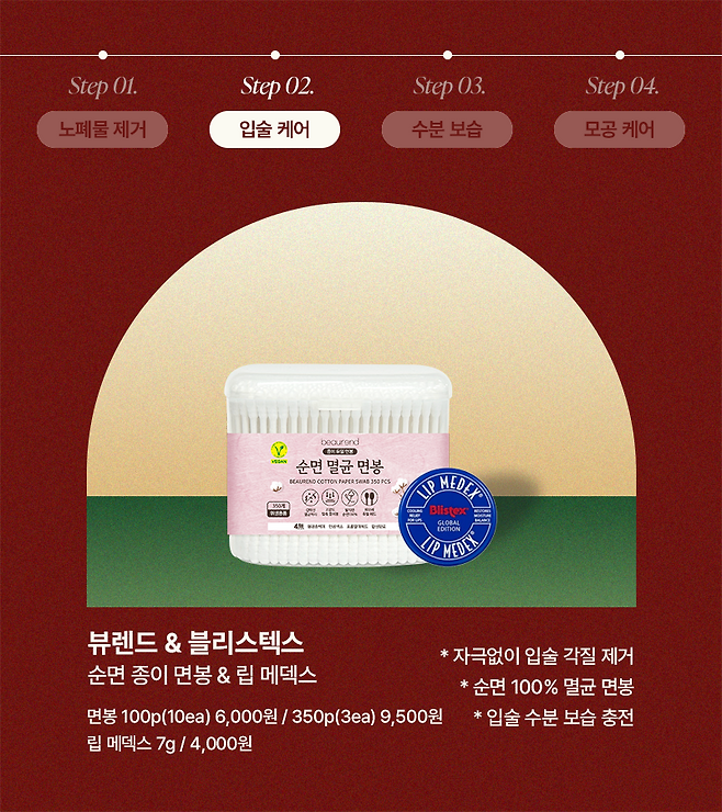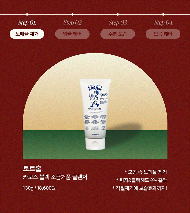 피부를 깨끗하게 정리하는 노폐물 제거,입술을 매끄럽고 건강하게 관리하는 입술 각질 제거,피부에 충분한 수분과 영양을 채워줄 수분 보습 충전,모공과 피부 결을 매끄럽게 가꾸는 모공 케어.