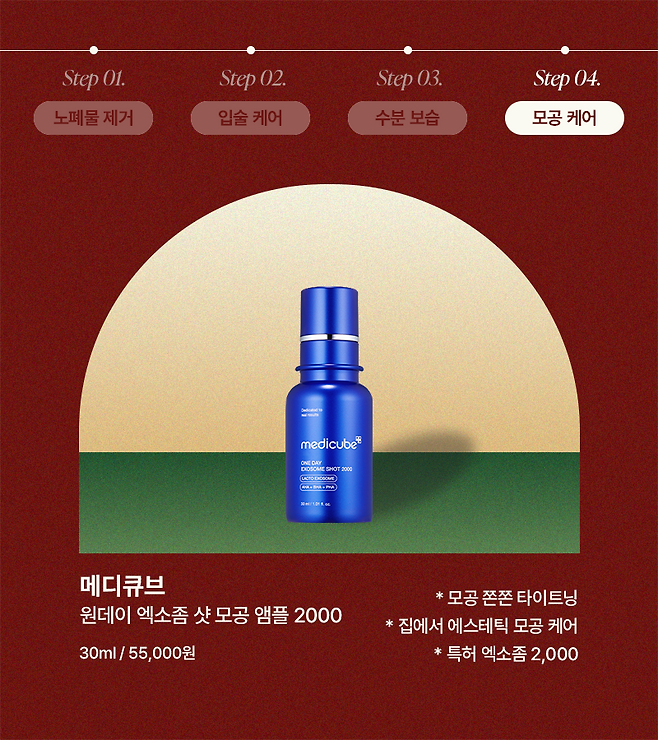 메디큐브의 원데이 엑소좀 샷 모공 앰플 2000은 넓어진 모공 관리와 피부 결 개선을 목표로 한 제품으로 4주 사용으로도 모공 밀도가 약 21.1% 일시적 감소하는 인체적용 실험 결과를 가지고 있다. 더더욱 믿음이 가는 모공 케어 제품!