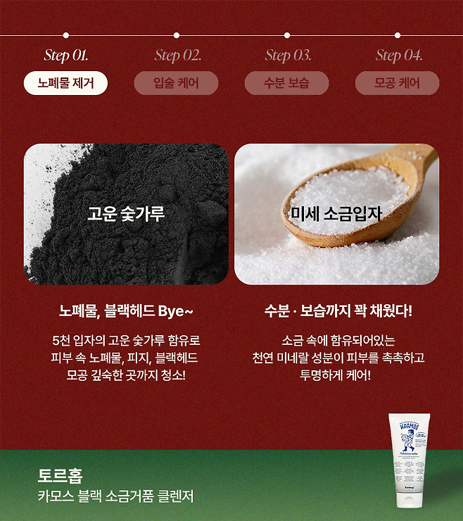 먼저 성분에 대해 알아보자면 뉴질랜드산 청정 소금 35%와 숯 가루가 포함되어 있어 피지 흡착력이 뛰어나고, 소금의 삼투압 효과로 피부 자극을 최소화하면서 피지와 노폐물을 제거해 준다고 한다.