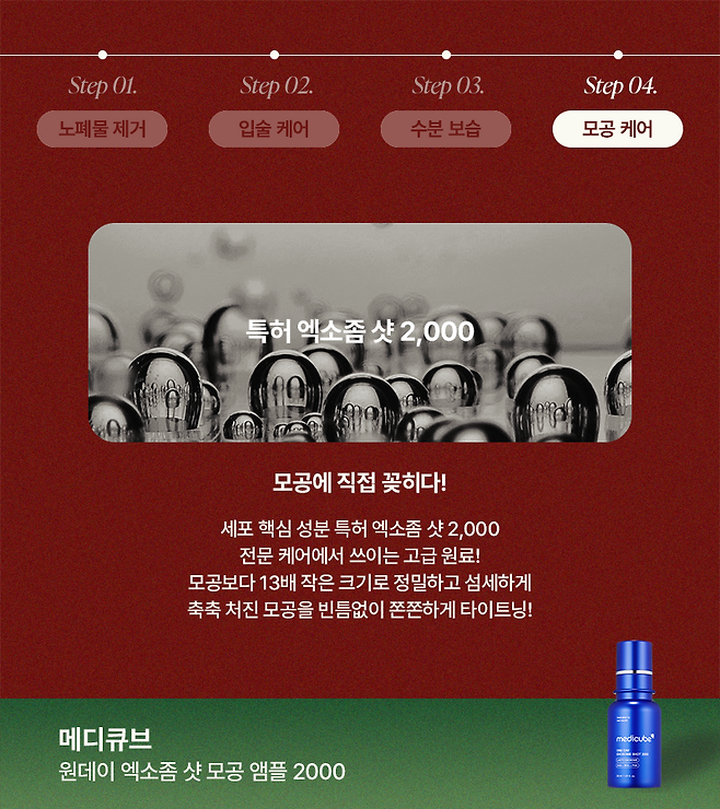 메디큐브의 원데이 엑소좀 샷 모공 앰플 2000은 넓어진 모공 관리와 피부 결 개선을 목표로 한 제품으로 4주 사용으로도 모공 밀도가 약 21.1% 일시적 감소하는 인체적용 실험 결과를 가지고 있다. 더더욱 믿음이 가는 모공 케어 제품!