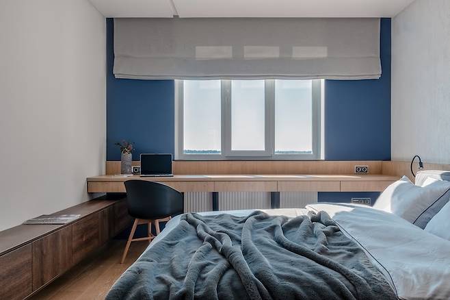 침실은 확연히 다른 무드로 방문자를 맞이한다. 짙은 파란색 페인트가 창가를 감싸며, 외부의 풍경을 마치 캔버스처럼 담아낸다.