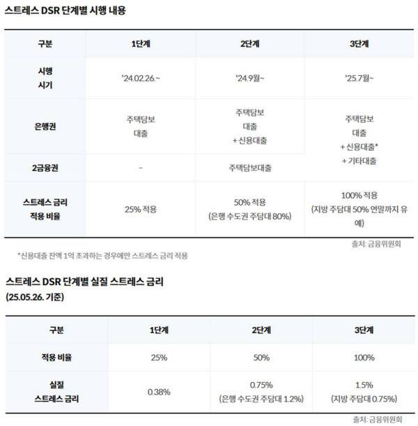오는 7월 시행되는 3단계는 수도권 모든 대출에 하한 1.5%를 100% 반영할 예정이다. 단, 지방의 경우는 0.75%를 유지하기로 했다. 현재 주담대 변동금리가 4%인 경우 스트레스 금리 1.5%를 더해 5.5%의 총 금리로 대출 한도를 계산하겠다는 것이다.