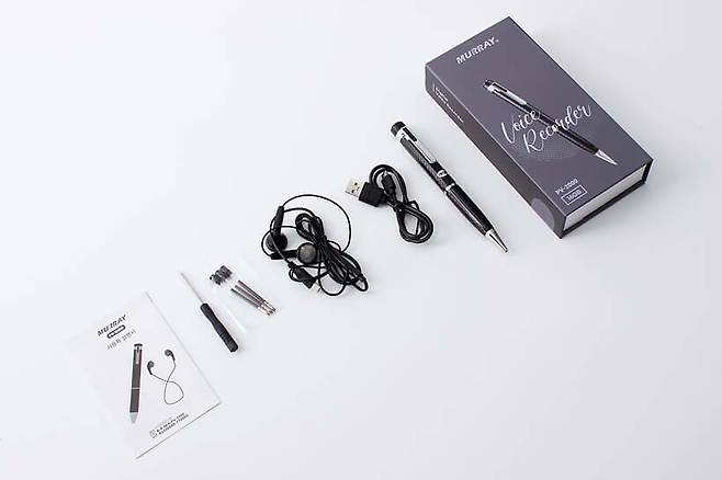 박스 안에는 구성품으로 머레이 볼펜 녹음기 보이스 레코더 PV-2000 본체와 충전용 USB 케이블, 이어폰, 교체용 볼펜심, 볼펜심 교체 도구, 그리고 사용 설명서가 들어있다.