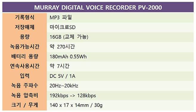 머레이 볼펜 녹음기 보이스 레코더 PV-2000은 180mAh의 배터리를 탑재해 최대 7시간 연속 녹음이 가능하며, 16GB에 약 200시간 분량을 녹음할 수 있어서 최대 사용 가능 용량인 128GB 메모리카드를 사용할 경우 약 1600시간 분량의 녹음파일을 저장할 수 있다. 보이스 레코더의 가장 중요한 부분은 녹음 품질로, 주변 잡음을 최소화하고 원거리 소리도 또렷하게 녹음되어서 기능에 충실함을 확인할 수 있다. 무엇보다 우리 생활에 흔히 볼 수 있는 볼펜의 모습을 그대로 하고 있기 때문에 녹음 중임을 알리고 싶지 않은 자리에서도 눈치 보지 않고 사용할 수 있다는 점이 가장 큰 장점이 아닐까 싶다.