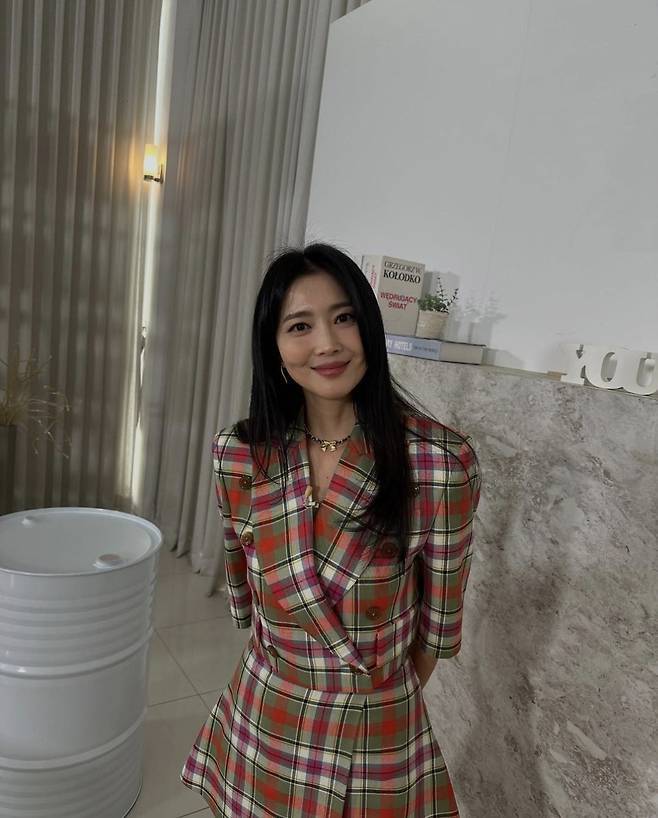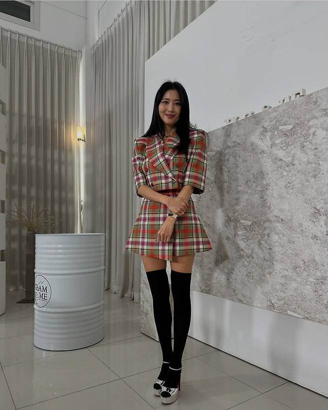 오윤아는 상의와 하의를 레트로 감성을 살린 비비드 한 체크 패턴으로 매치해 시선을 사로잡는 스타일을 연출했습니다.