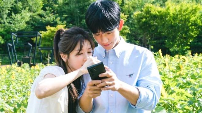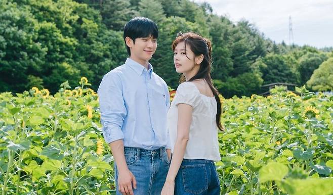 공개된 사진 속 최승효, 배석류가 달콤한 첫 입맞춤을 나눈 해바라기 꽃밭 사이 본체들의 대기 시간 모습이 이목을 집중시킨다. 마치 그림 같은 풍경을 배경으로 다정한 인증샷을 남기는 두 배우의 청량하고 달달한 비주얼 케미스트리가 감탄을 자아낸다. 남사친, 여사친 면모의 편안하고 자연스러운 분위기 속 정소민을 바라보는 정해인의 부드러운 눈길과 따뜻한 미소가 설렘을 폭발시킨다. 회를 거듭할수록 핑크빛 로맨스를 가속화하며 심박수를 상승시키는 정해인, 정소민의 로코 시너지를 다시 한번 확인했다.