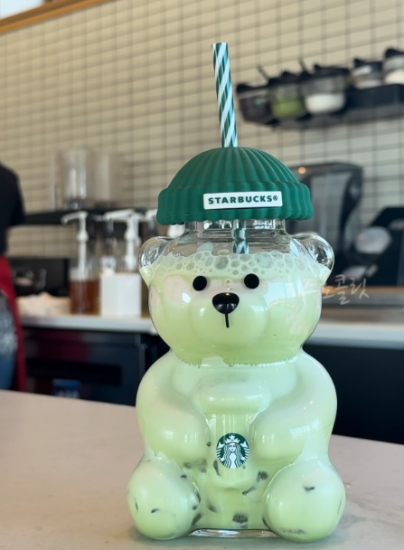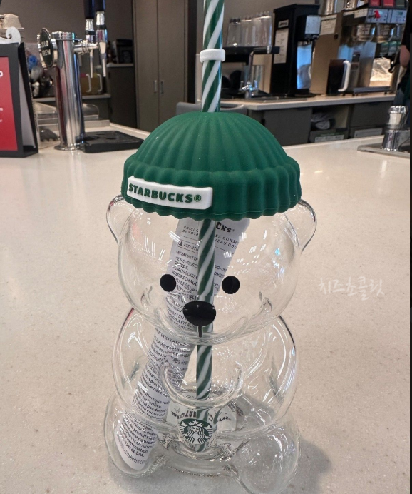 스타벅스 컵을 들고 있는 투명한 곰돌이 모양에