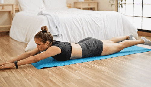 매트에 배를 대고 엎드린 상태에서 손을 앞으로 뻗습니다. 상체와 하체를 동시에 들어 올려 손끝과 발끝을 최대한 길게 뻗습니다. 자세를 유지하며 버텼다가 천천히 내려오세요.