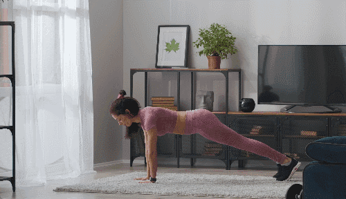 매트에 플랭크 기본자세로 엎드려 팔꿈치를 완전히 펴고 시선은 바닥을 응시합니다. 오른발을 공중으로 들었다가 내린 뒤, 왼발도 같은 방식으로 번갈아 들었다가 내립니다.
