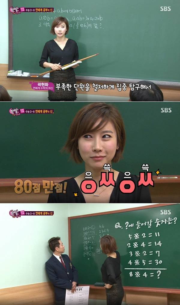 SBS '한밤의 TV연예'에서는 대학수학능력시험을 앞두고 연예계 대표 공부의 신들을 한 자리에 모았습니다. 이 중 연예계를 대표하는 '수학의 신'으로는 이화여대 수학과를 나온 개그맨 곽현화가 등장해 눈길을 끌었습니다.