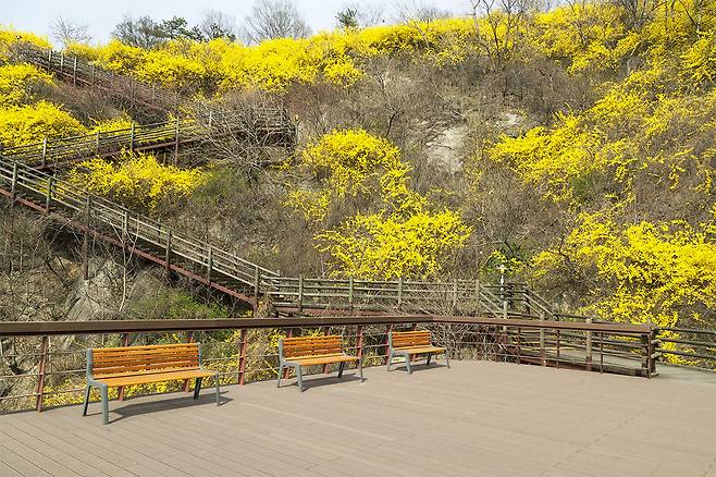 응봉산의 개나리 명소 중에서도 가장 유명한 곳은 정상 전망대다. 20~30분 정도 가볍게 오르면 도착할 수 있는 이곳에서는 개나리로 둘러싸인 채 서울의 전경을 내려다볼 수 있다. 푸른 하늘과 한강, 그리고 노란 개나리가 어우러지는 풍경은 마치 한 폭의 그림처럼 펼쳐진다.