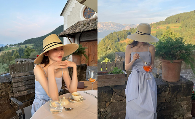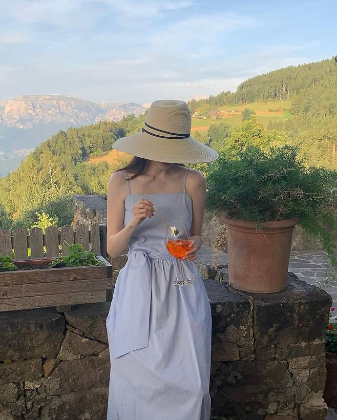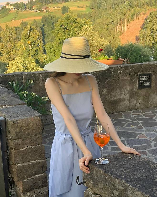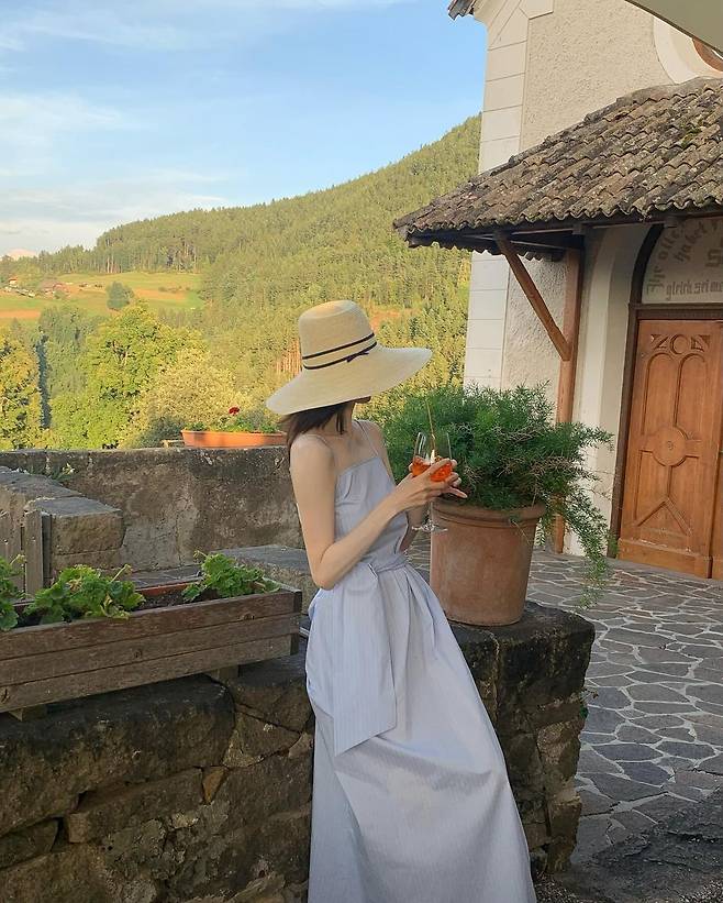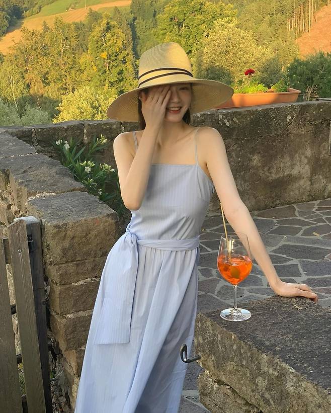사진 속 강민경은 하늘색 스트라이프 탑 롱 원피스를 입고 밀집 모자를 써서 청순한 미모를 자랑하며 이탈리아 여행을 즐겼다.