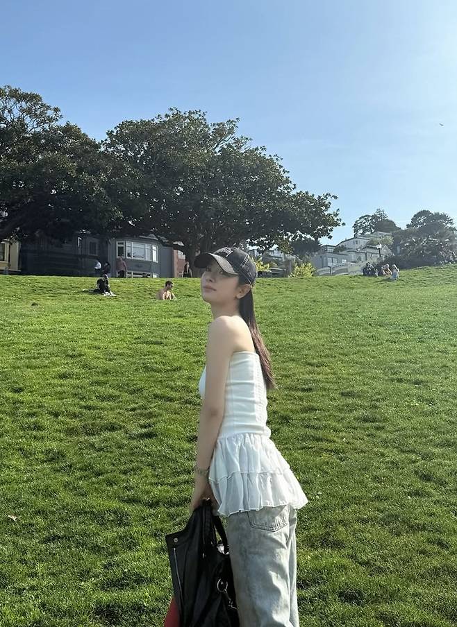 공개한 사진에서 김지연은 찢어진 청바지 위에 어깨가 노출된 화이트 오프숄더 캉캉 미니 원피스로 힙하면서도 러블리한 피크닉룩을 선보였다.