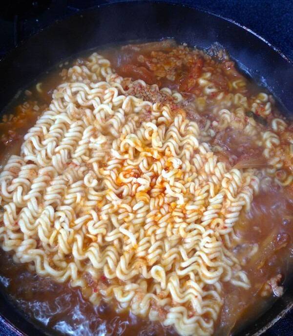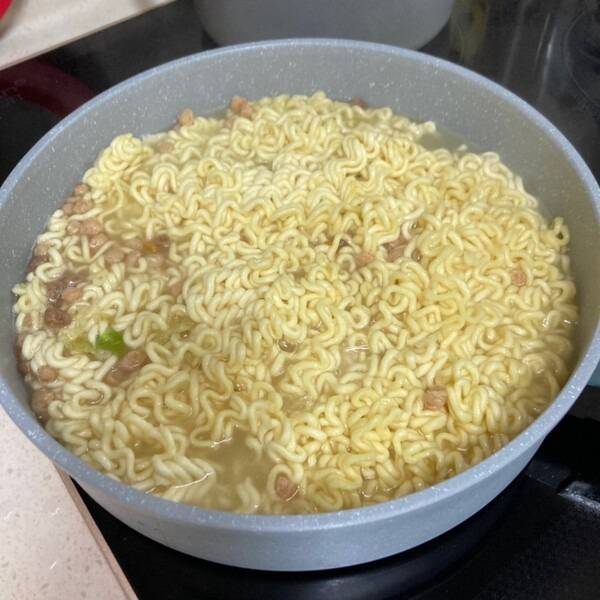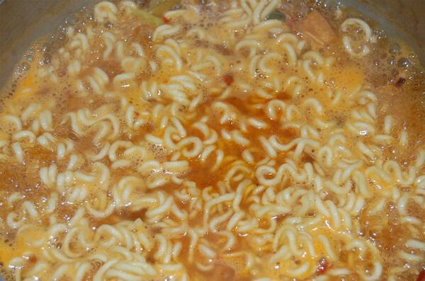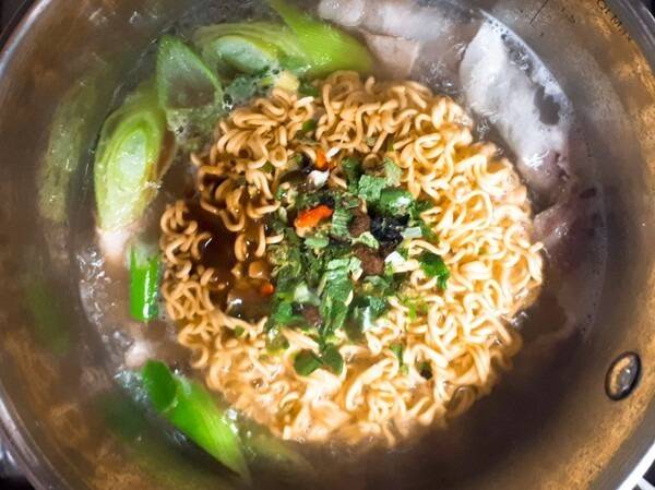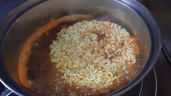 STEP 2: 새 물 600ml+면+스프 70% 넣고 3분 끓이기