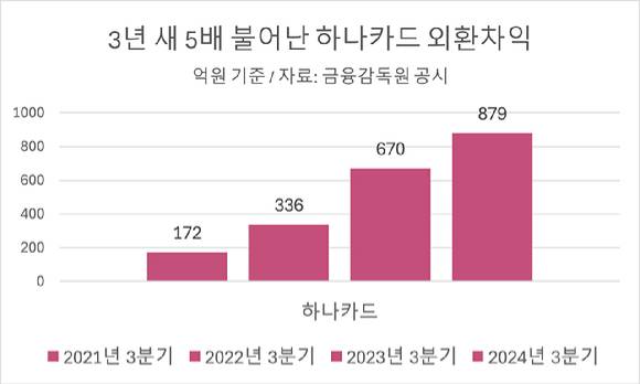 19일 금융감독원에 따르면 하나카드는 올해 1분기 256억원, 2분기 275억원, 3분기 348억원의 외환차익을 거뒀다. 누적으로 879억원에 이른다.