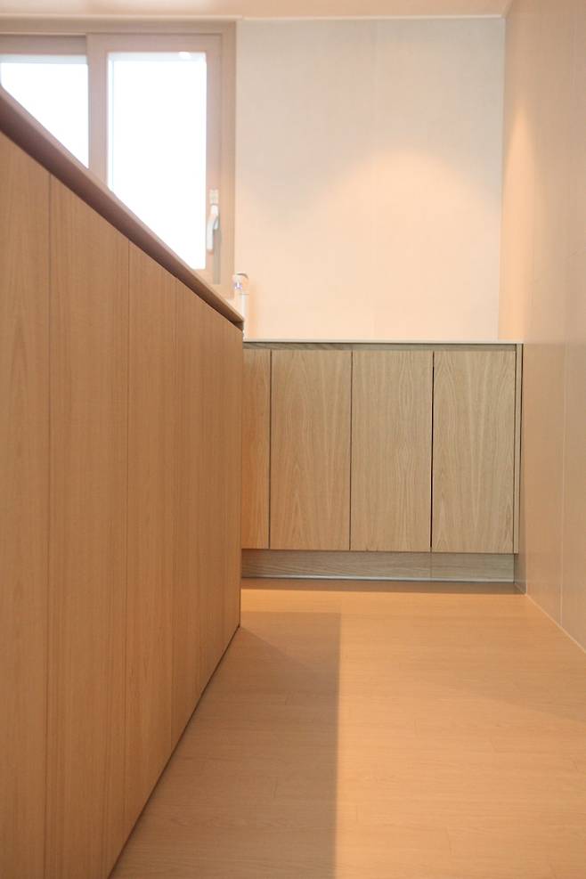 모든 가구는 푸쉬 도어를 모두 사용해 외부에서도 손잡이 없이 열고 닫을 수 있도록 깔끔하게 제작 했어요.