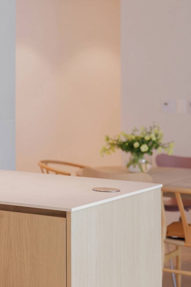 아일랜드 한쪽엔 매립형 콘센트를 설치해 블렌더와 전기 포트 등 조리하면서 필요한 전기제품을 바로 사용할 수 있도록 만들었어요. 생각보다 주방에서 사용하는 가전이 꽤 많은 편이고 주로 아일랜드에서 조리를 하기 때문에 매립형 콘센트는 필수라 생각해요.