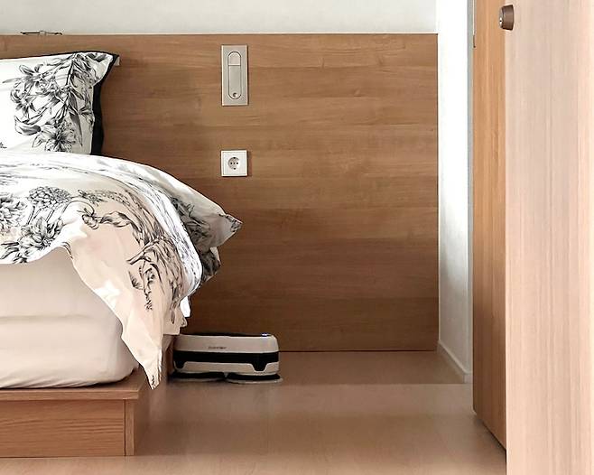 침대 외에는 가구가 없다보니 로봇 이모님이 청소하시기엔 최적의 공간입니다. 부지런한 살림꾼이 아니기 때문에 많은 짐들을 무조건 안 보이게 수납하는 것에 집착하는 이유 중 하나죠.