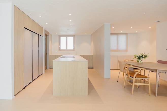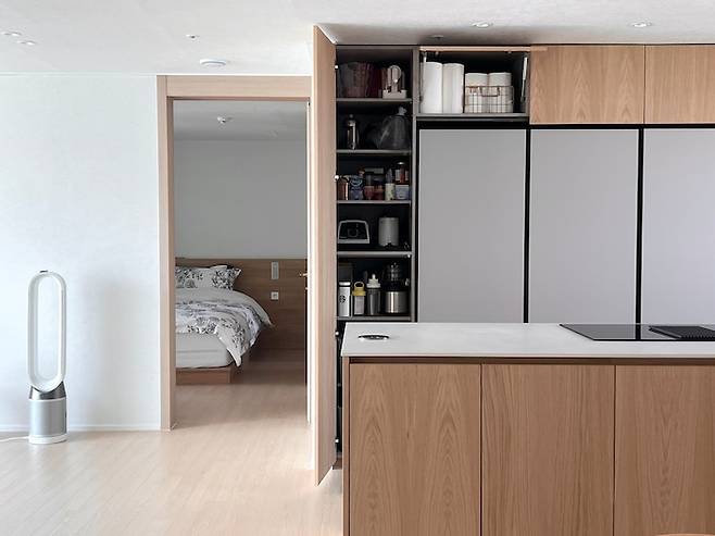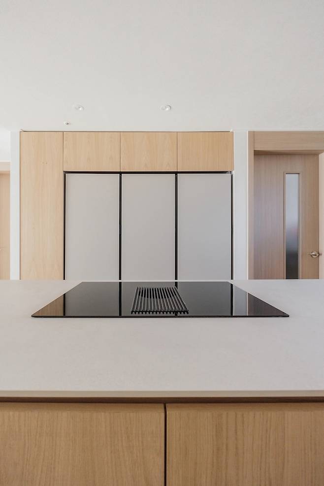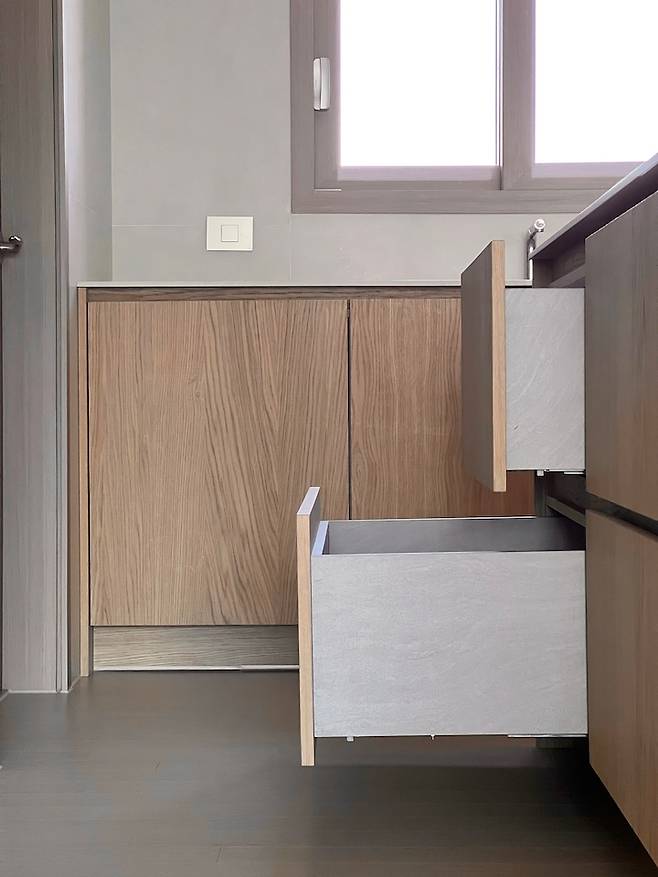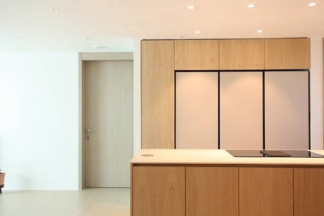 때마침 냉장고 손잡이 없이 터치로 오픈 가능한 키친핏이 나와 얼마나 기뻤는지 몰라요. 먹는 것을 굉장히 즐기는 편이지만 냉장고에 보관하는 식재료는 그때 그때 구입하는 편이라 키친핏의 용량이 부족하진 않았어요. 저희는 냉동, 냉장, 김치냉장고 순으로 설치를 했고 남은 공간은 모두 무늬목으로 수납 공간을 만들었습니다.