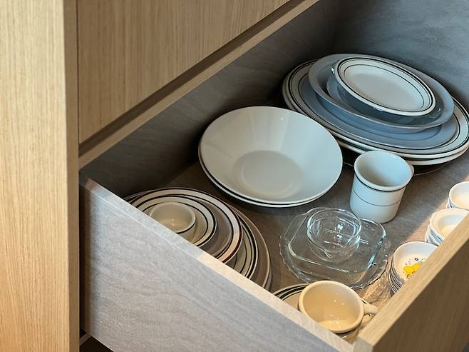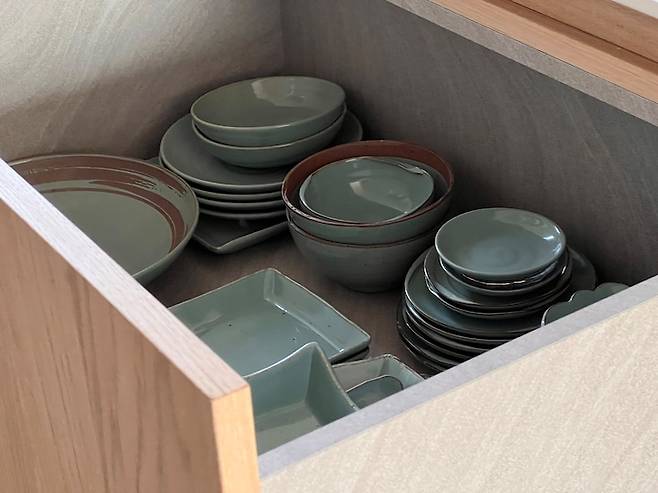 자주 사용하는 식기들은 아일랜드 하부장의 서랍에 수납해 사용 중인데, 서랍형이다 보니 한 눈에 모든 그릇을 볼 수 있어 굉장히 편리해요. 상부장을 사용할 땐 늘 까치발을 해서 그릇을 찾는 게 일이었는데 말이죠.