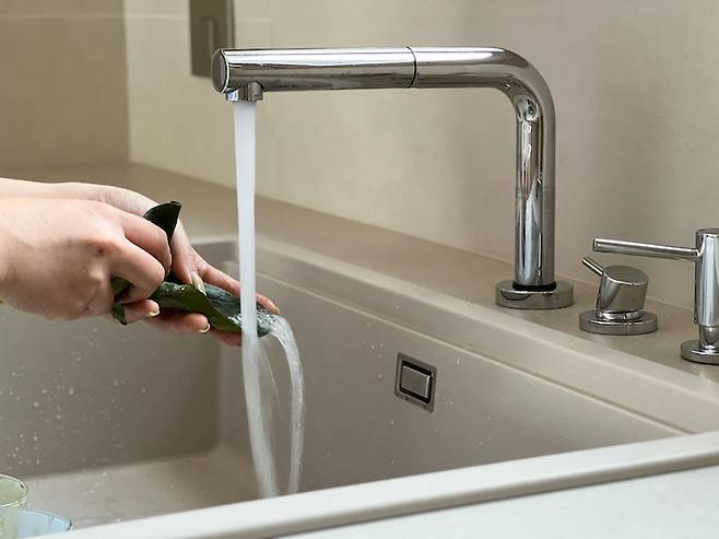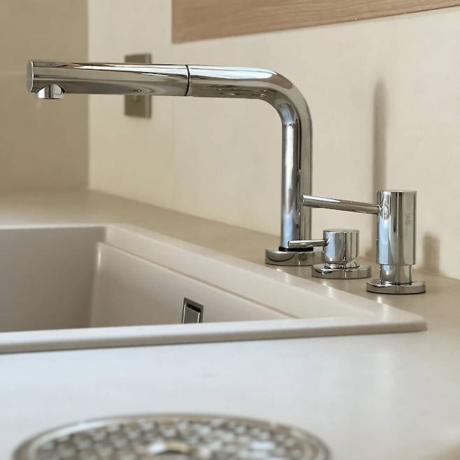수전은 어디까지나 나만의 만족일 수 있겠지만 주방 인테리어 하면서 가장 고민이 컸던 부분 중 하나였어요. 아무래도 샤워형 수전에 익숙했기 때문에 사용감이 불편하지 않을까 싶었지만 깔끔한 디자인과 인출형 방식이 결합되어 불편 없이 사용 중이에요.