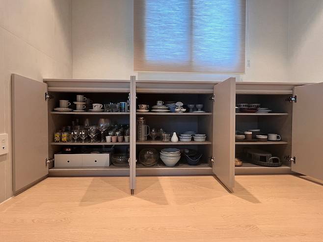 그리고 알파룸과 팬트리 공간이 있던 이 곳은 모든 가벽과 문을 철거 후 다이닝 공간으로 새롭게 바꿨습니다. 창문 아래쪽은 하프장을 짜서 그 안에 자주 사용하지는 않지만 꼭 필요한 어마어마한 양의 그릇과 식기들을 보관 중인데 그릇들이 꽤 많죠? 사실 그릇보다 컵과 잔이 많아서 이사 후 정리하면서 많이 놀랬답니다.