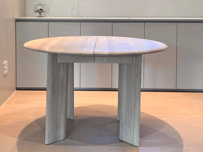 집 안의 분위기인 밝은 원목 제품이면서 원형 테이블로도 사용이 가능하고, 확장하게 되면 타원형으로 6인은 거뜬한 이 제품이 딱 제가 찾던 식탁이었어요. 색은 부드럽지만 원목 테이블이라 무게는 절대 가볍지 않아 혼자서 확장하는 건 어렵다는게 장점이자 단점입니다.