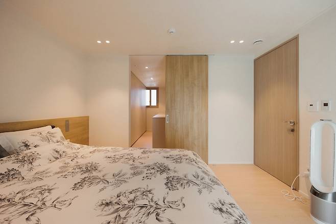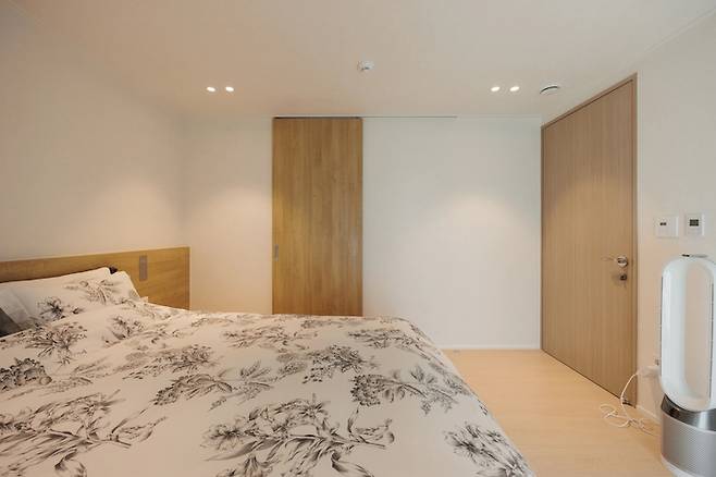 드레스룸과 안방 욕실이 있는 공간과 분리를 하기 위해서 저희는 미닫이 문을 설치했어요. 침대 헤드와 동일하게 필름으로 시공을 했습니다.