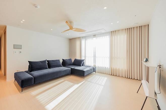 그리고 햇볕을 가릴 수 있는 커튼은 바닥과 색이 비슷한 린넨 재질의 밝은 베이지 톤 암막 커튼과 속 커튼으로 거실이 조금 더 넓어 보일 수 있도록 매치했어요.