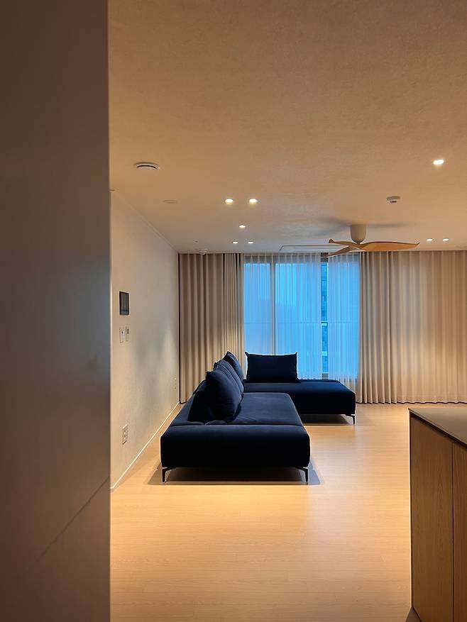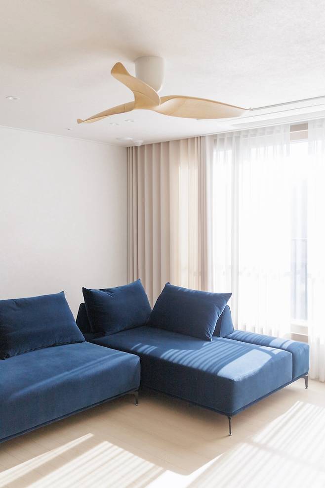 대신 메인등이 있던 자리에 실링팬을 설치했는데요. 실링팬은 유행을 탄다, 아파트는 천장이 낮아서 굳이 필요가 없다는 이야기도 많지만 정남향 집이라 여름에 너무 더울 것 같기도 했고 이 제품을 검색한 다음엔 실링팬을 돌리지 않더라도 포인트로 너무 예뻤거든요. 겨울이지만 음식 냄새를 환기하고 집안 공기 순환을 위해 몇 번 사용해보니 역시 잘한 선택인 것 같아요.