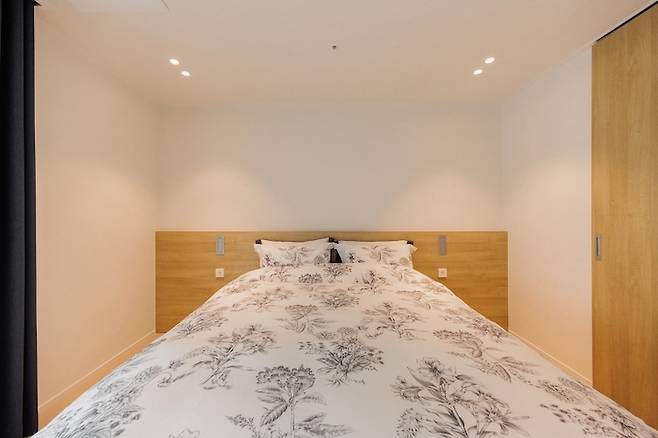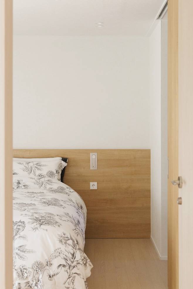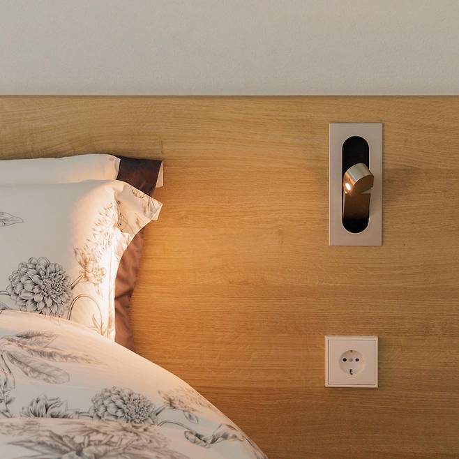 침대 헤드 위쪽의 간접등은 생략하고 매립형 독서등으로 설치했어요. 사용하지 않을 때는 쏙 들어가는 형태라 먼지가 앉지 않아 관리하기 쉽고 조도도 은은해서 책 읽기에 굉장히 좋습니다. (물론 책보다는 휴대폰을 더 많이 보긴 하지만요.)