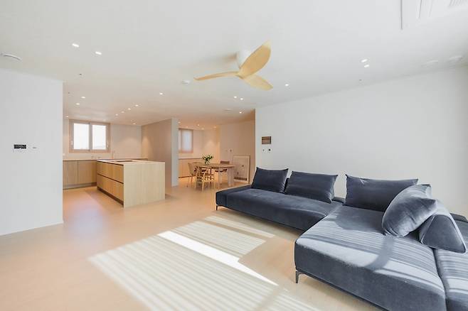 그렇게 저희는 주방과 다이닝과 자연스럽게 공간이 이어지면서도 소파 색감으로 약간의 분리감을 줄 수 있도록 배치해 보았습니다.