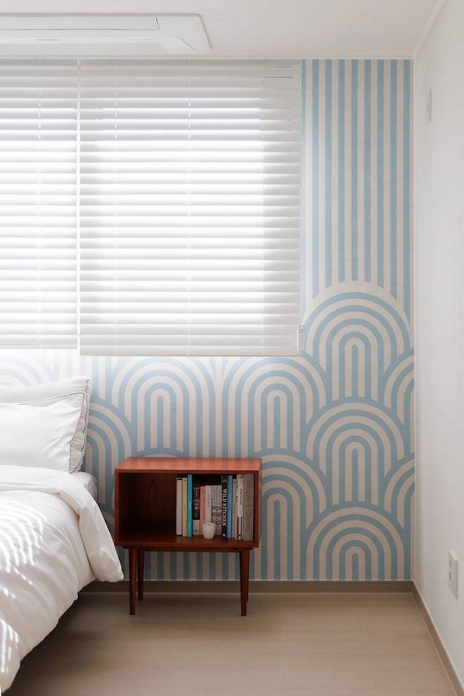 오래 전부터 사용해 보고 싶었던 벽지가 있었기도 했구요. 다른 방들보다 더 오랜 시간 해가 들어오는 기분 좋은 하늘 색의 포인트 벽지를 과감히 이 공간에 사용하기로 했습니다. 다른 가구 배치 없이도 충분히 공간을 꽉 채워 간단한 북케이스만 지금은 두었어요.