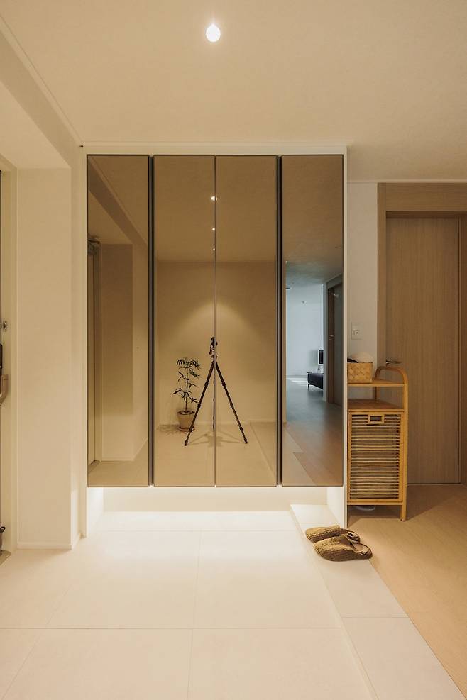 주방에 집중 또 집중을 했기 때문에 현관은 군더더기 없이 깔끔하게. 그것이 현관의 컨셉이었습니다. 신발장 맞은편에 팬트리 공간으로 가벽이 설치되어 있었지만, 팬트리 문을 달게 되면 현관이 너무 답답하고 좁아보이겠더라구요. 팬트리에 수납할 짐이 많지 않은 2인 가구라 저희는 과감히 그 가벽도 철거를 했습니다. 현관 만큼은 대형 평수 느낌이 나도록 말이죠.