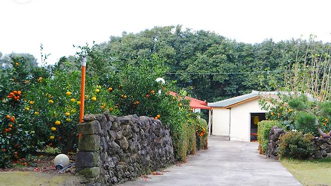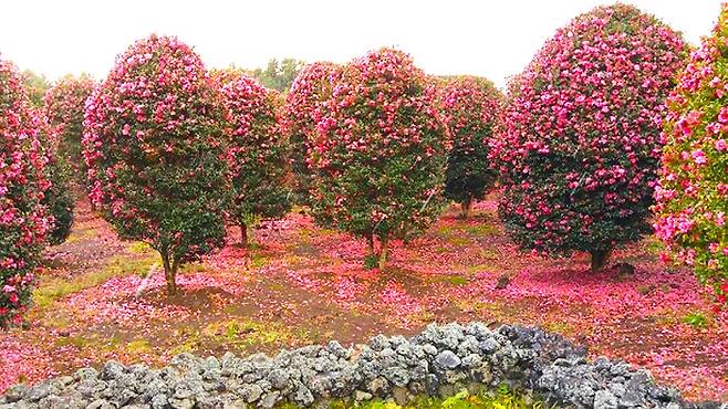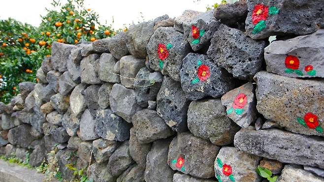 차가운 바람이 부는 겨울, 제주 남원읍 위미리에는 붉은 꽃잎이 돌담을 따라 피어난다.