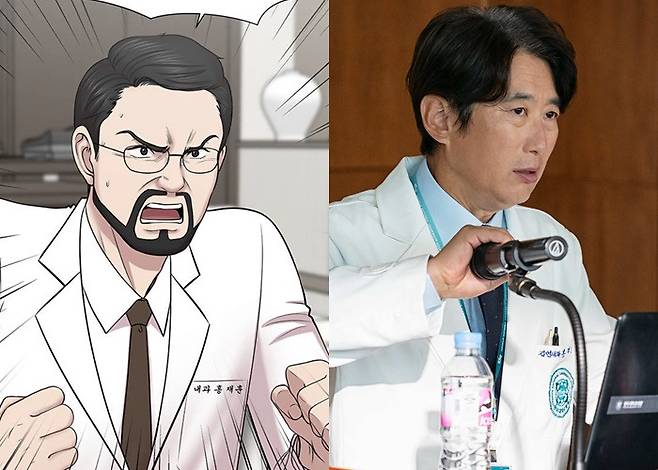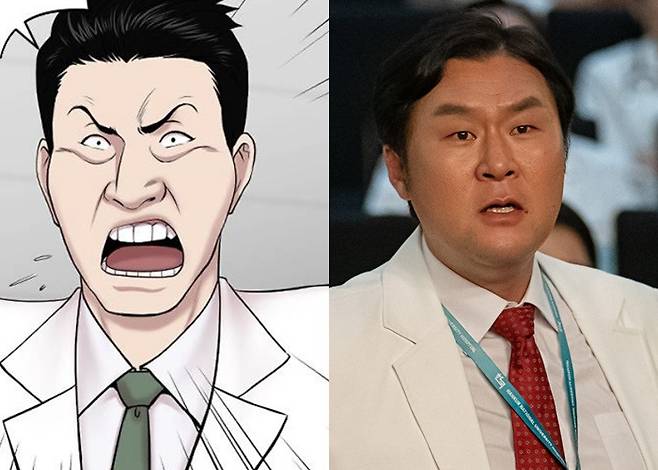 원작 웹툰의 홍재훈(왼쪽)과 드라마에서 그 역할을 맡은 김원해의 모습. 사진제공=네이버 웹툰·넷플릭스
