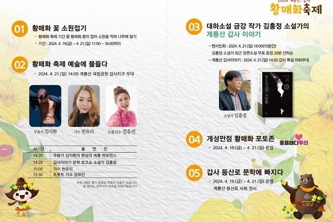 • 축제 행사: 4월 21일(일) 오후 2시, 김지환 무용가, 가수 한유리, 트롯가수 강유진 등 다양한 공연이 펼쳐집니다. (변동 가능성 있음)