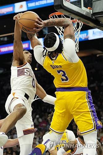 Phoenix Suns forward Ryan Dunn (0) fouls Los Angeles Lakers forward Anthony Davis (3) during the first half of an NBA preseason basketball game Thursday, Oct. 17, 2024, in Phoenix. (AP Photo/Ross D. Franklin)
