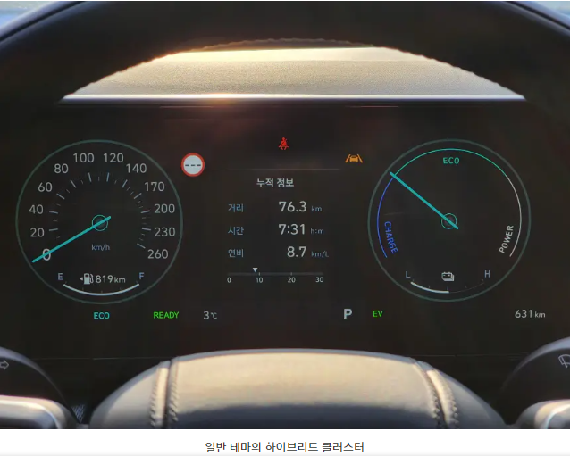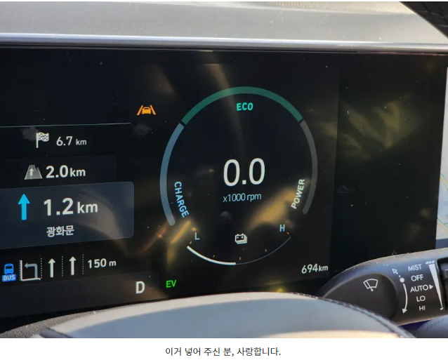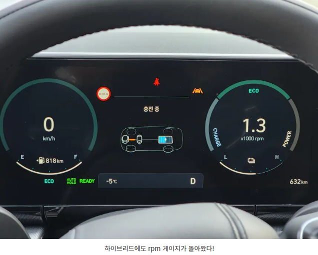 하지만 7세대로 넘어오면서 이렇게 rpm을 보여주는데 EV모드 인디케이터 외에도 rpm 숫자를 보고도 알 수 있고, 엔진 구동이 잦은 환경에서 엔진이 어떻게 움직이는지 확인할 수 있기 때문에 저는 정말이지 잘했다고 말해주고 싶더군요.