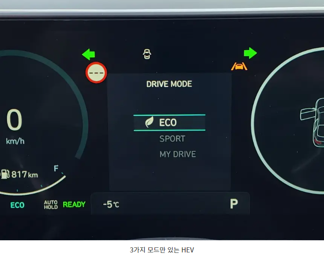 일단 가장 먼저 눈에 띄는 차이점은 바로 드라이브 모드입니다. 4륜이 들어간 3.5 모델에서는 ECO-NORMAL-SPORT-MY DRIVE-SNOW 이렇게 5가지로 구성됩니다. 하지만 하이브리드 모델에서는 간단하게 ECO-SPORT-MY DRIVE 이렇게 3가지로만 구성되어 있습니다.