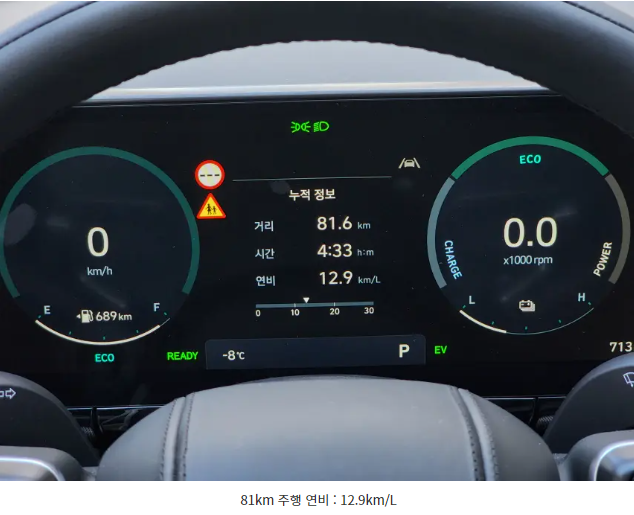 시승은 총 81.6km를 주행했는데 소요된 시간은 4시간 33분입니다. 꽉 막히는 도심 주행이 80%, 약간 막히는 환경이 10%, 나머지 10%는 공회전 또는 잠시 경험했던 고속 주행 환경이었습니다. 하이브리드이다 보니 조금 더 높은 결과를 기대했지만 약간 부족해보이는 총 연비 12.9km/L를 기록했습니다.