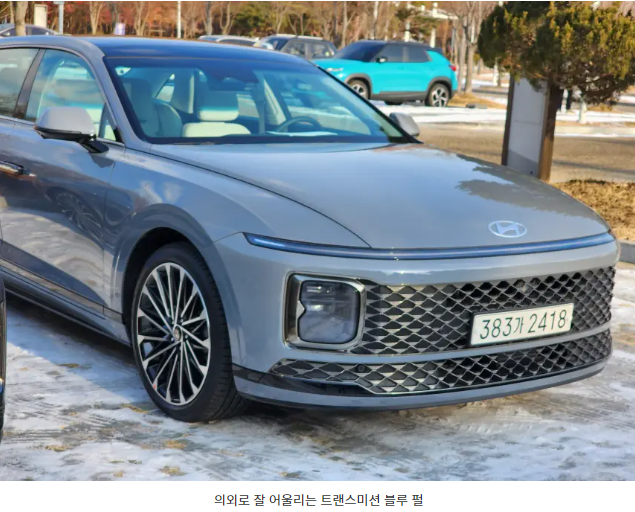 트랜스미션 블루 펄의 경우, 메탈릭 도장임에도 불구하고 굉장히 크리미하고 무광같이 매트한 느낌을 주는 것이 특징입니다. 아이오닉 시리즈에서 먼저 선보인 컬러인데 점잖은 준대형 세단에 어울릴까 걱정했지만 의외로 잘 어울리는 모습이었습니다.