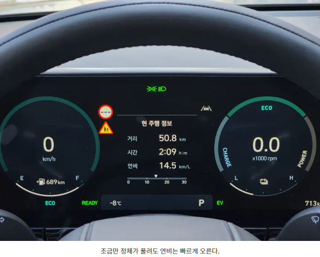 극심한 정체를 벗어난 뒤 조금 더 현실적인 환경에서는 아래와 같이 14.5km/L의 연비를 보였는데 이 정도 수준이 실제로 체감하게 되는 결과일 것으로 보입니다.