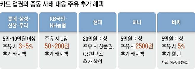 롯데카드는 ‘디지로카 Auto’ 카드를 비롯한 주유 특화 카드를 발급해 한 번에 5만원 이상 주유하면 5% 추가 캐시백을 월 5000원 한도로 제공하고 있다. ‘삼성iD STATION 카드’를 비롯한 삼성카드 상품도 같은 혜택을 준다. 신한카드는 5만원 이상 주유 시 3% 추가 캐시백을 월 1만원 한도로 제공한다. 하나카드는 5만원 이상 주유 시 2500원 추가 캐시백해주는 혜택을 월 2회씩 준다.