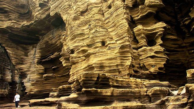 용머리해안을 이루는 사암층은 수천만 년에 걸쳐 퇴적과 침식을 반복하며 만들어졌다.
