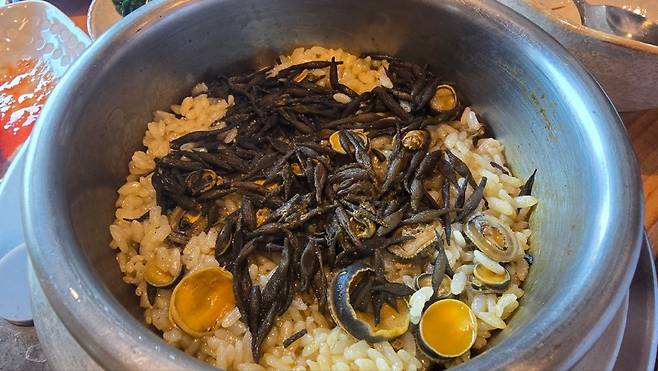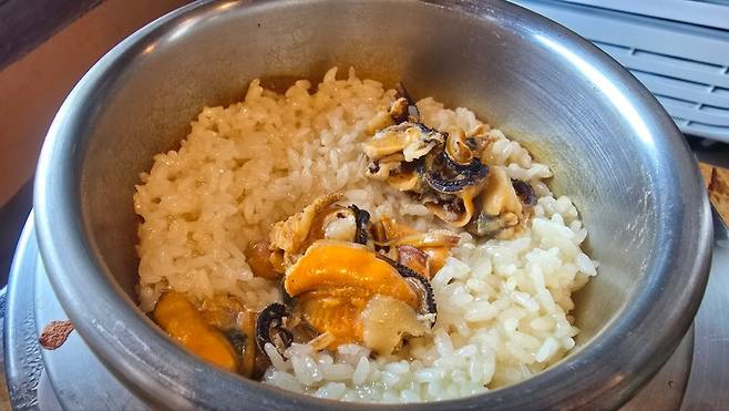 반찬을 하나씩 음미하는 도중 따개비밥과 홍합밥이 솥밥으로 나왔다. 솥뚜껑을 열어보니 따개비와 홍합이 먹음직스럽게 보인다. 밥은 간을 한 상태라 굳이 간장을 끼얹지 않아도 될 정도다. 밥은 김가루가 얹어진 밥그릇에 푼 다음에 뜨거운 물을 부어 누룽지로 만들어 먹는다.