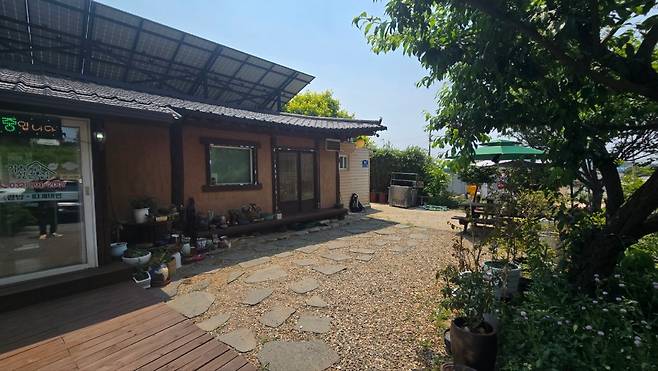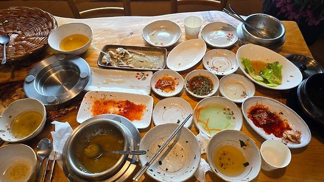 식당이 약간은 외진 2차선 도로에 있는 탓에 눈에도 잘 띄고 앞에 공간도 넉넉해 10여대 정도의 자동차가 너끈히 주차할 수 있다. 식당 앞은 전원주택처럼 조경이 잘 되어 있다. 문을 열고 들어서면 그리 크지 않은 홀에 4인석 테이블이 10여개 정도 놓여 있다. 오후 1시경 방문했는데 겨우 한 테이블 비어 있는 자리에 앉을 수 있었다.